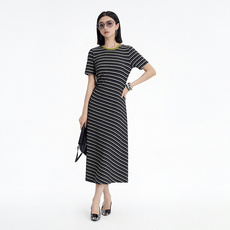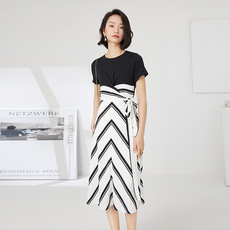 优雅通勤 针织拼接条纹绑带A字高腰连衣裙女19880