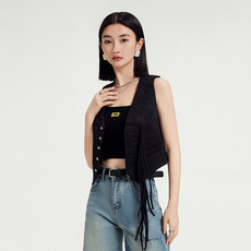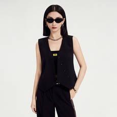 黑色酷帅斜门襟无领修身马甲女2024新款时尚外套21370