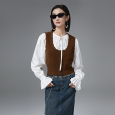 2025新款叠穿两件套减龄学院风绑带装饰针织马甲衬衣套装女